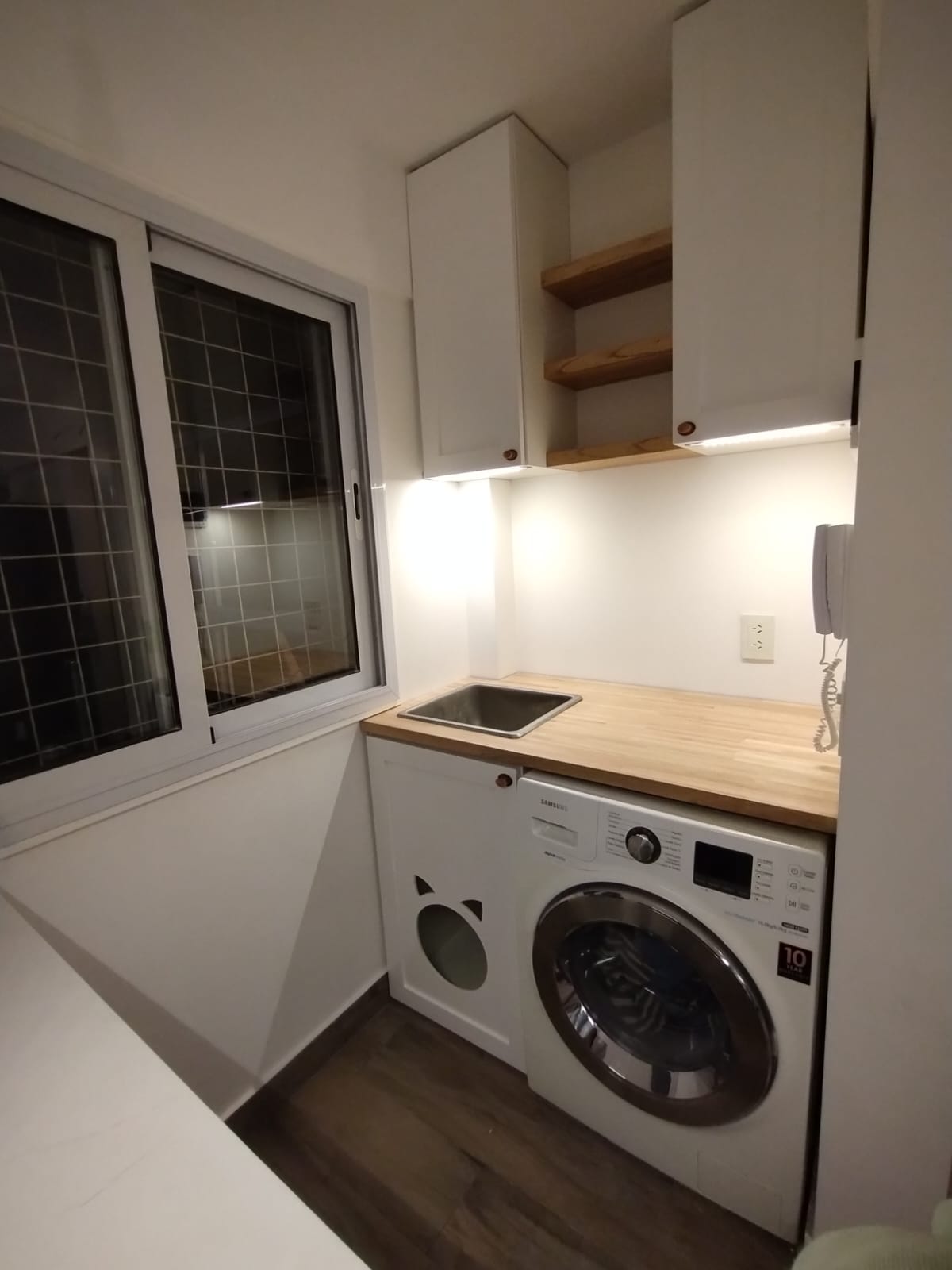 Realizado en laqueado blanco, mesada alistonada en Grandis y estantes enchapados en Paraíso.