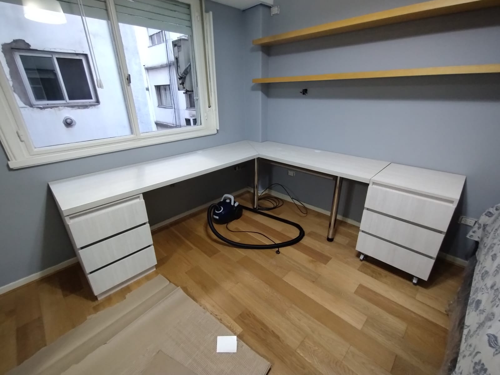 Escritorio realizado en melamina Teka Artico y Estantes enchapado en Lenga lustrado.
