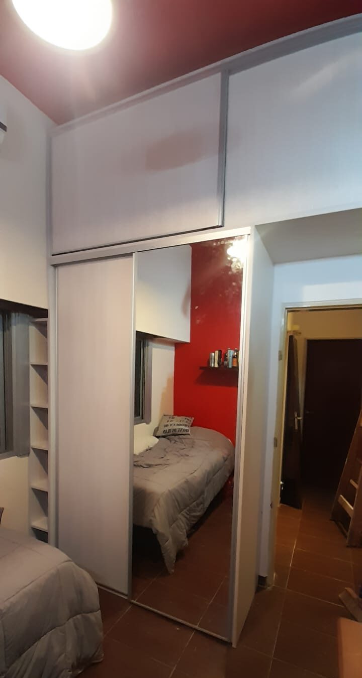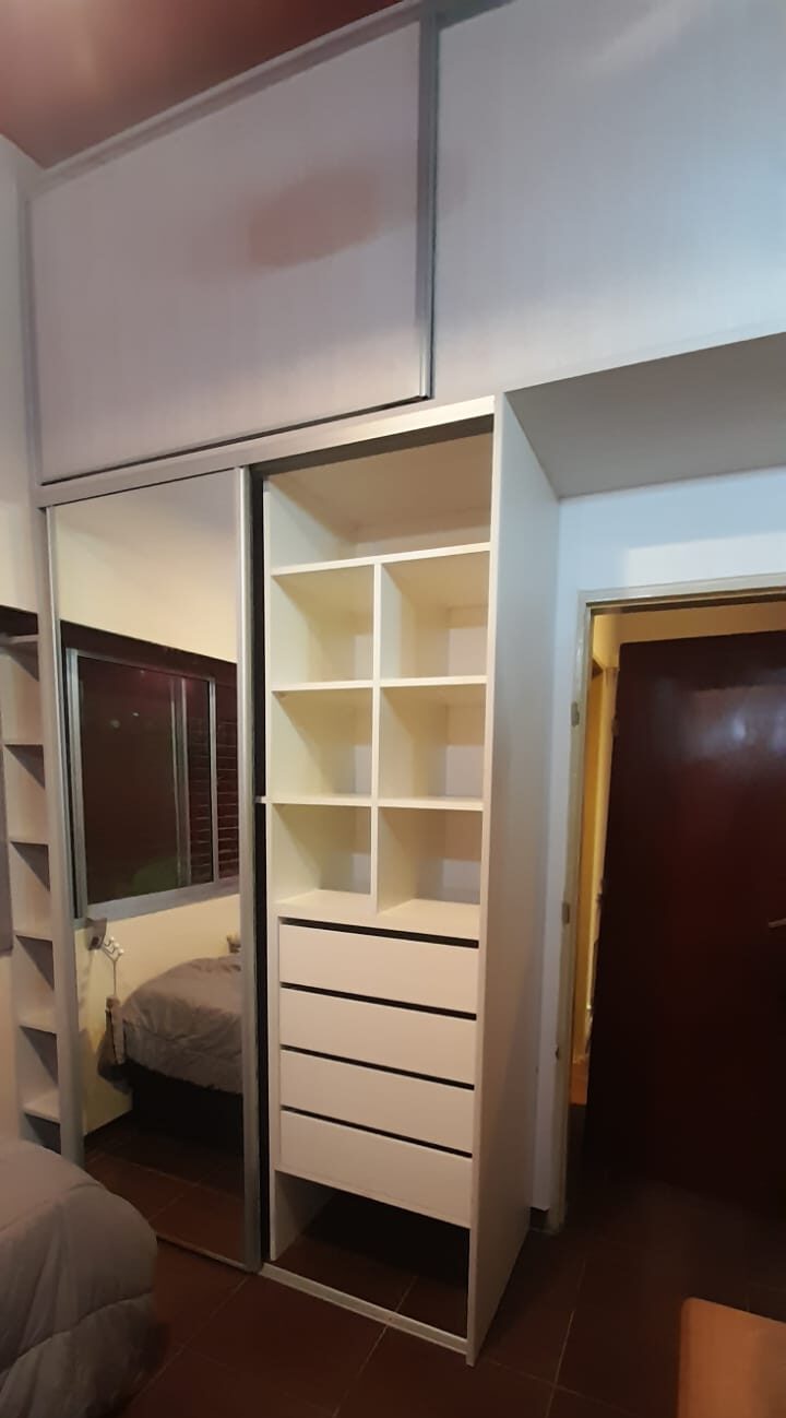 Placard con interior realizado en melamina Blanca y puertas en melamina Blanco Nature y espejo.